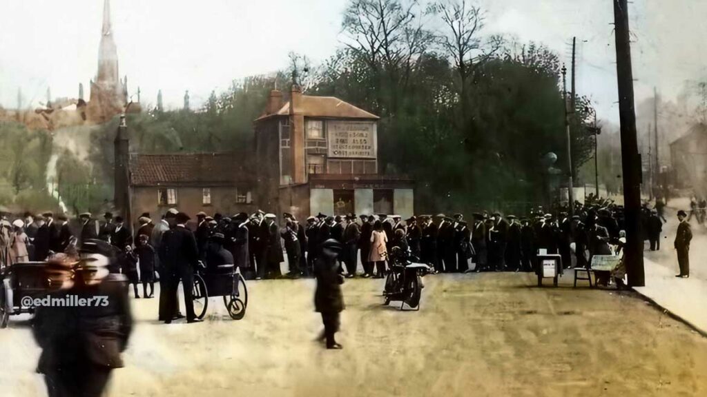 This fundraising friendly against Orient attracted another big crowd as the recoloured photograph depicts, with an orderly queue up Stonebridge Hill and other supporters crossing the road to join.