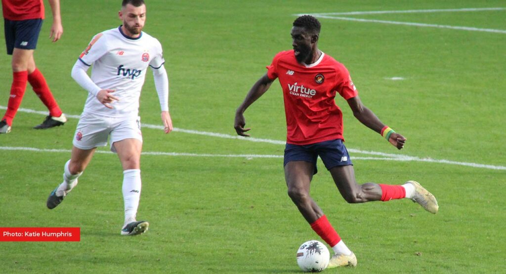 It was a bad five minutes for the Fleet as they lost Cissé to a somewhat convoluted red card. White and Kay went to ground in a challenge and as the Fleet defender sprang to his feet, Kay dramatically hit the deck again as Cissé moved in to act as peacemaker but didn’t appear to make any significant contact. Indeed the midfielder seemed so surprised by his dismissal that it took several minutes for it to become apparent which player had actually been dismissed.