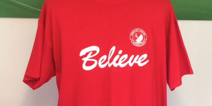The Ebbsfleet United club shop is selling reduced-price ‘Believe’ T-shirts online and at the ground from today.