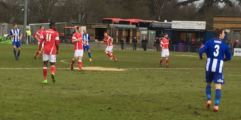 There was little room on a small pitch to play, even without the surface, and Fleet did their best to string short passes together as imposed themselves on the game in the first half. On 26 minutes, Kedwell’s dogged persistence got him a clear sight for a pass and Stuart Lewis ran on to the delivery but was stopped in his tracks by two defenders as he shaped to shoot.
