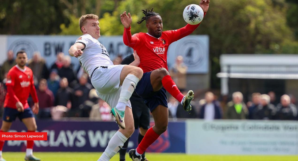 With a record attendance packed in, Boreham Wood claimed the first real chance of the game. A long throw-in from Bush was swung into the area which led to a goalmouth scramble that Declan Skura sent out for a corner off Jack Payne’s shot. Successive set pieces for the Wood could have been a threat but the Fleet cleared without too much concern.