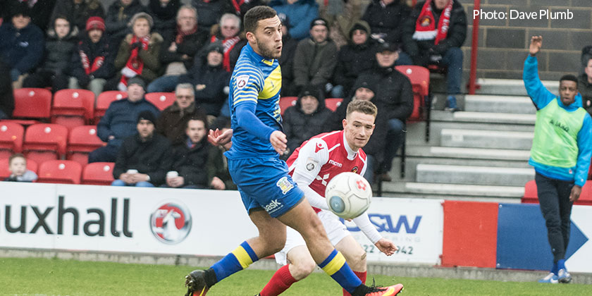 McMahon admitted today’s game on a heavy pitch and in squally conditions at times was never going to be a classic but he was pleased with what he saw. “[In the first half] we had good opportunities with Jack Connors (pictured), we had Keds in there as well. We had enough little opportunities to capitalise. It was never going to be free-flowing from us in that first half. We were against a side with four wins and a draw in their last five, three good attacking players and you’ve got to respect that. They’ve brought in Storer who was the captain of the title-winning Cheltenham team two years ago. You can look at a league position and be fooled sometimes, they’ve changed their team. They’re far better now than when we played them earlier on in the season. In that first half we dealt with what they had well and I always felt we could kick on in the second half.