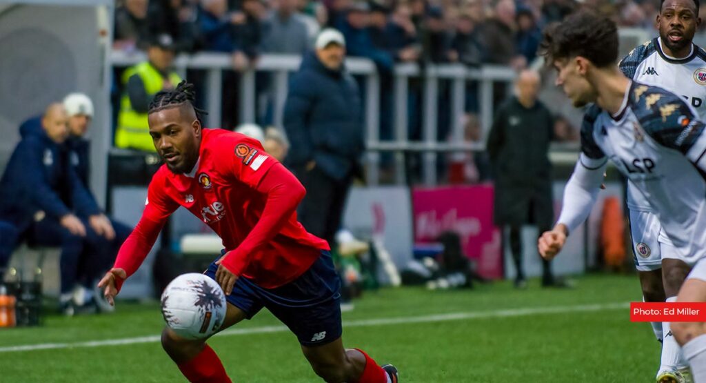 The attacking display from the reds continued, with darting runs from Dominic Poleon causing the Bromley back line some problems, while McQueen linked up well with Hayden White behind him.