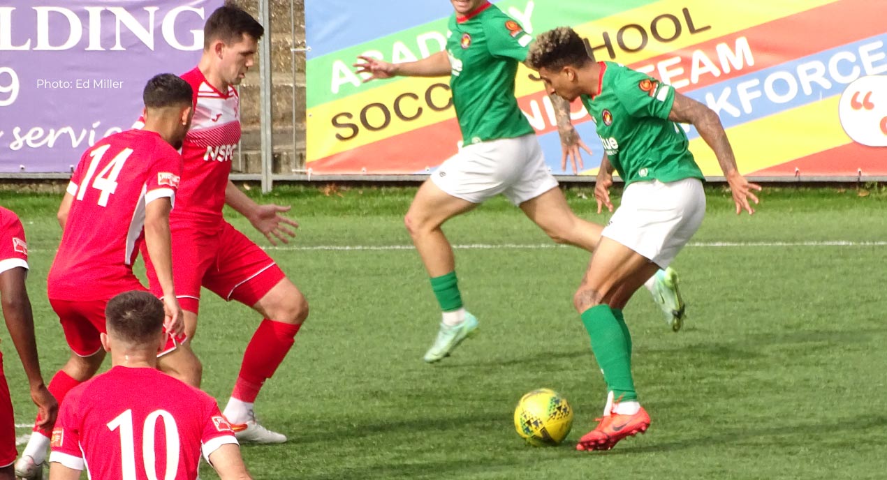 It was end to end stuff for a time and when Jordan Cheadle’s free-kick was headed inches wide of Haigh’s post, Fleet then sprinted up the other end, Tanner and Joe Martin exposing the home defence to give Jack Paxman half a sight of goal, but Thomas was able to get a hand and leg in the way of that one.