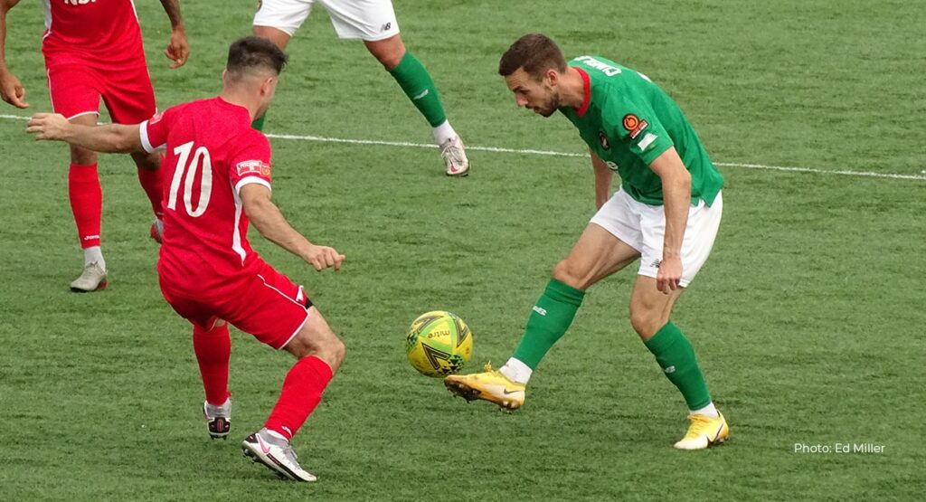 Carshalton were bright in the opening stages but were forced into a defensive posture for a little while as Fleet kept possession and pushed to stamp some authority on the game – but an early goal was the visitors’ undoing as Carshalton got away on the break on seven minutes. An attack down the left by Lewis White gained them ground and with Danny Bassett lurking in the box, a cross played on by Daniel Bennett found him and he was able to fire past an unguarded Haigh.