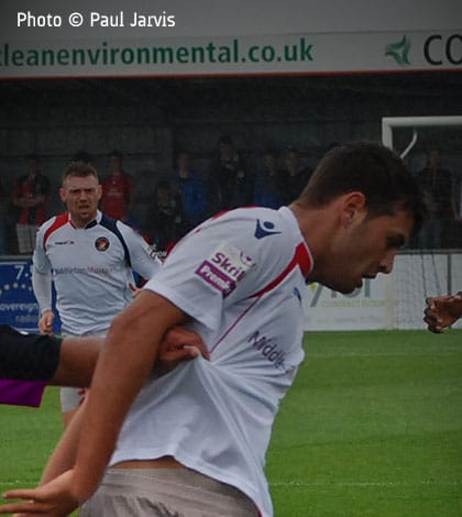 Fleet caught early sight of goal with Daryl McMahon’s free kick deflected behind, while Acheampong and Thalassitis saw efforts come to nothing and Billy Bricknell forced a low save at the foot of the post from Carl Pentney. But the home side pushed on, taking the game to their visitors, and they were rewarded on 26 minutes when Matt Lock powered a shot against the Fleet crossbar and Rob Edmans was on hand to head home the rebound.