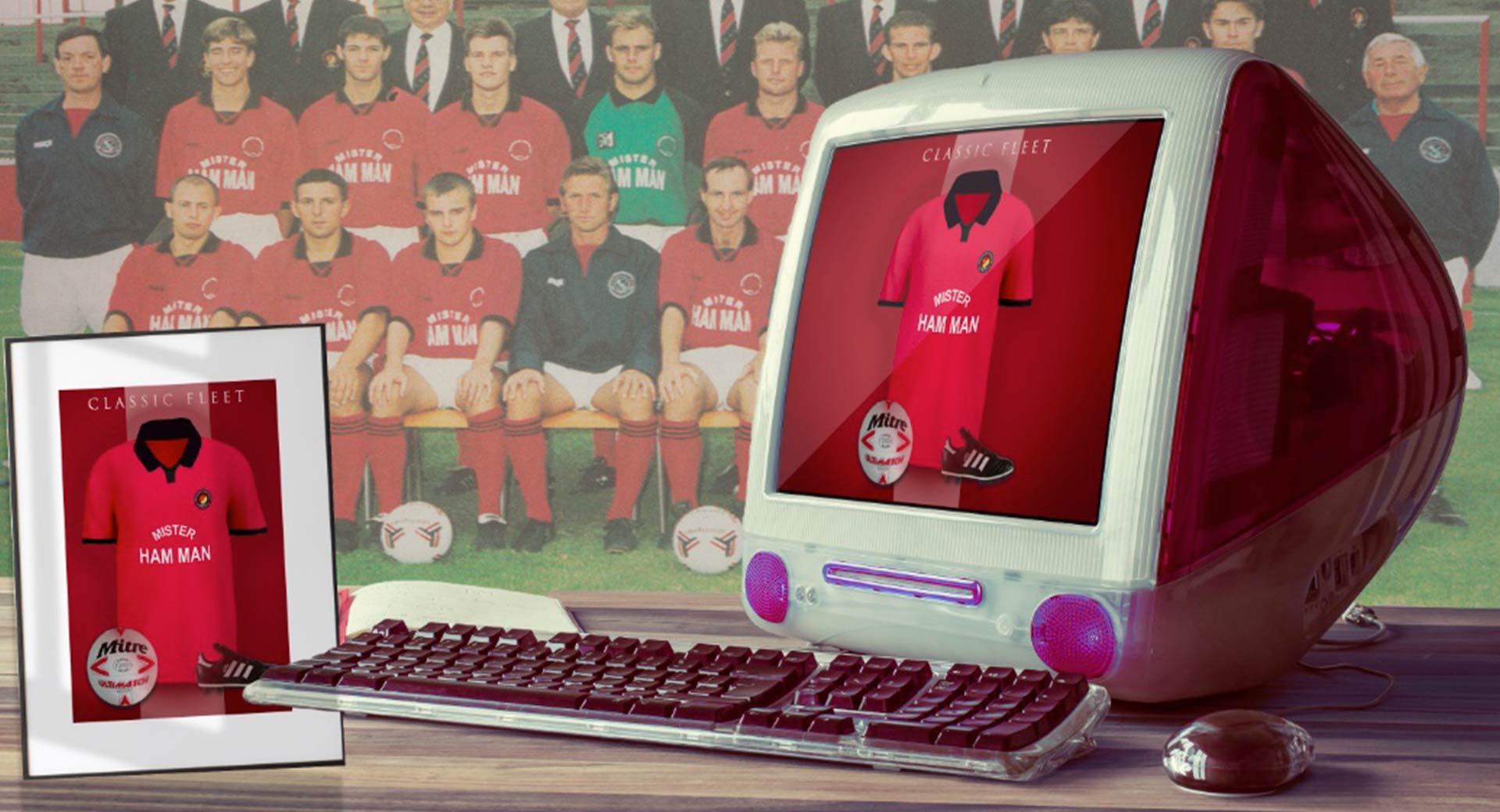 And then we jump forward four decades with the release of a reimagined version of the fondly remembered Mister Ham Man shirt, most famously worn at Aston Villa in our 1995/96 FA Cup run, in red with black trim as was the style of the time. In addition to the well-loved sponsors’ logo, the coloured version of the Gravesend & Northfleet badge, introduced for our 50th anniversary, is also part of this shirt design.