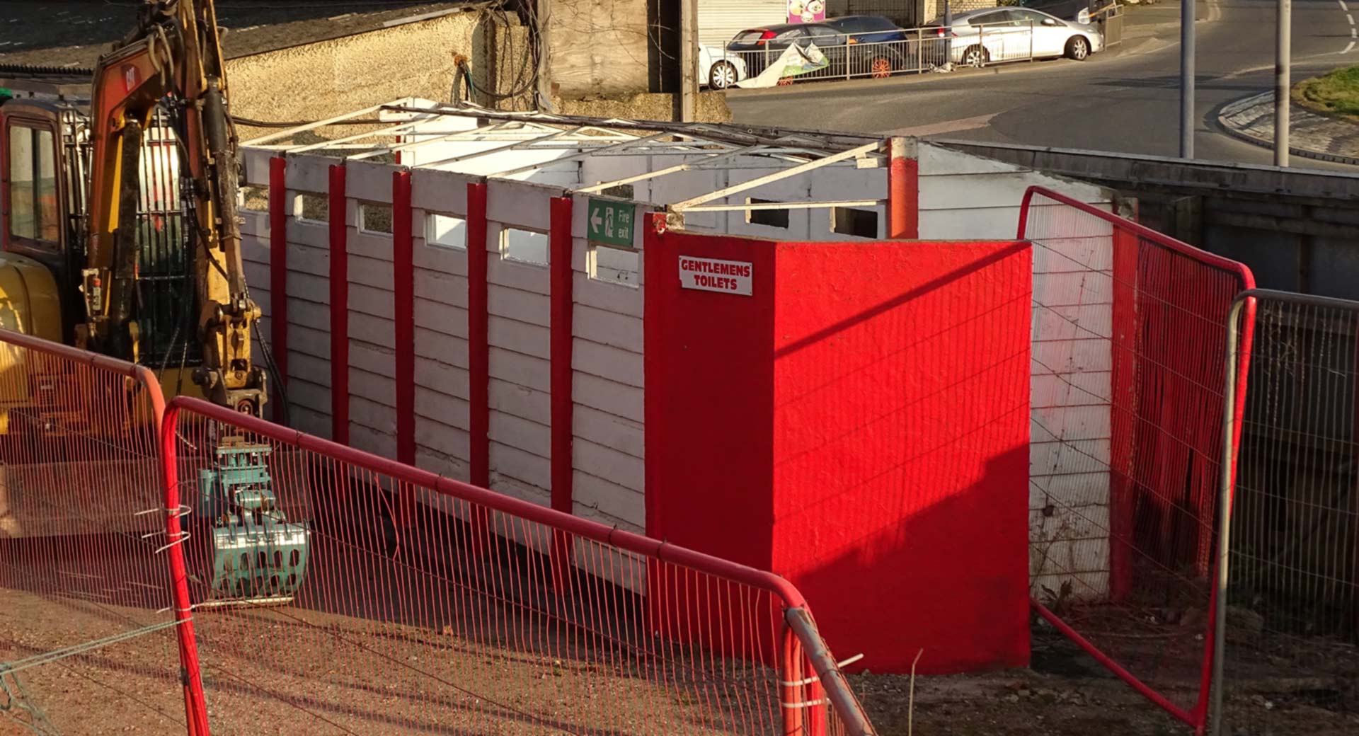 Initial demolition works have seen the “snipers” toilets – as they are so lovingly referred to by our supporters – removed, a legendary and historic feature of the ground which we know will be missed. However, the asbestos roofing and limited drainage and services rendered the building extremely outdated and no longer fit for purpose.