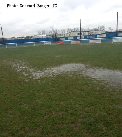 Following an inspection that was a mere formality after more overnight rain, today’s Skrill South fixture at Concord Rangers has been postponed due to a waterlogged pitch.