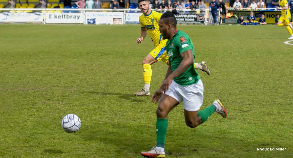 A tame start provided little in the way of chances for either side, Ben Chapman’s run across the pitch and cross/shot on six minutes about the only advance into the 18-yard box. With the ball in the air for much of that period, Fleet were at their most effective when they could get it down and play it and Christian N’Guessan’s powerful run from the halfway line gave Poleon half a chance with a turn and shot that drifted past the upright.