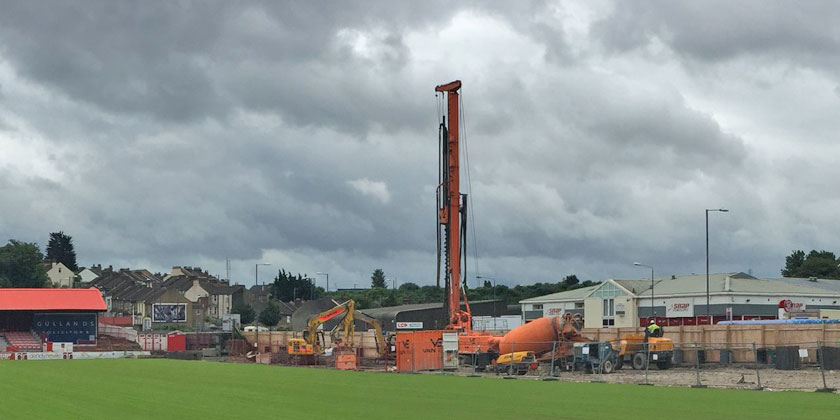 Following the completion of the bulk of demolition a fortnight ago, contractors TSP have been busy on the excavation side of things, working on the drainage in the area under where the new stand will be constructed. The piling mat was then laid out at the beginning of last week, which serves as a platform for the piling rig that now looms over Stonebridge Road.