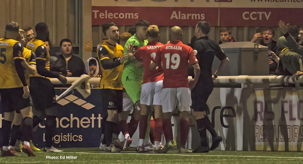 The early goal was a setback for the Fleet from the first minute and with the game ending with three sendings-off, Kutrieb conceded that both he and his side need to brush aside decisions that go against them. Sefa Kahraman received a second yellow alongside Maidstone goalkeeper Tom Hadler’s straight red, while the Ebbsfleet manager was also sent to the stands for what was later revealed to be leaving his technical area as he attempted to pacify the situation and move his players away from the fracas.