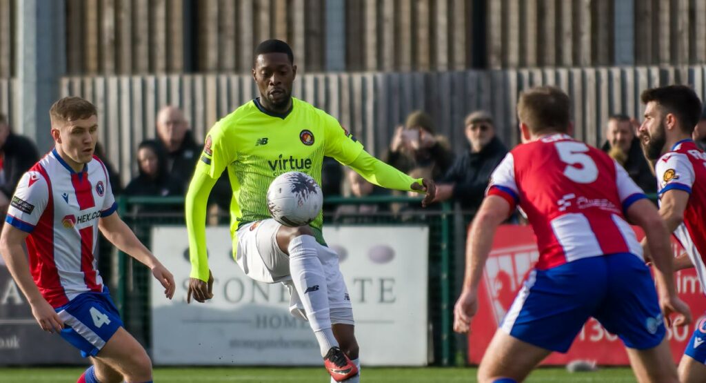 Dan Pybus’ foul on Ben Chapman 30 yards from goal produced the afternoon’s first chance and Toby Edser delivered a ball into the area but Dom Poleon couldn’t quite connect with the ball as Luke O’Neill won the visitors’ first corner.