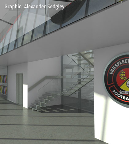 Ebbsfleet United this morning released the first visuals of the new stadium complex, with these concept graphics of the new entrance interior. Visuals of the actual stadium itself will be available to view at tonight’s meeting in the Fleet Social Club, from 6pm-8pm.