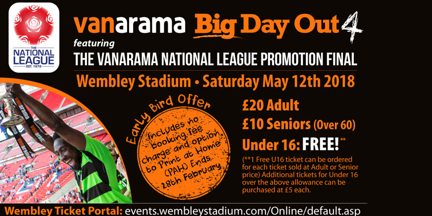 The Vanarama National League has released details of the opportunity for ALL football fans to purchase Early Bird tickets for their Promotion Final on Saturday 12th May 2018 at Wembley Stadium connected by EE.