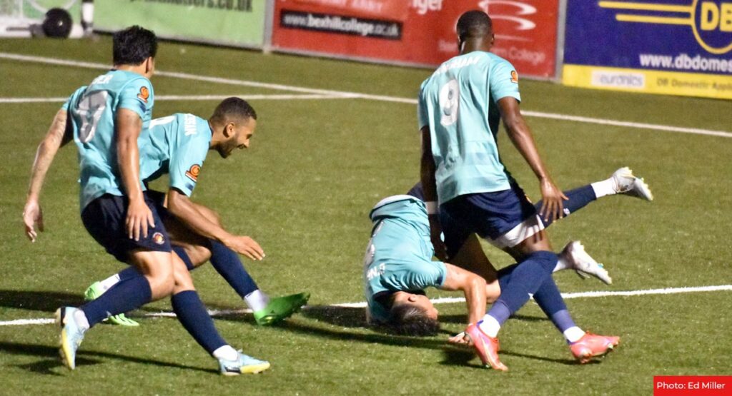 Kutrieb’s men kept trying to pick the lock and Poleon fired over from Edser’s pass but he was surrounded and frustration grew as a well-drilled Eastbourne side were able to get men behind the ball at every opportunity to block any path to goal.