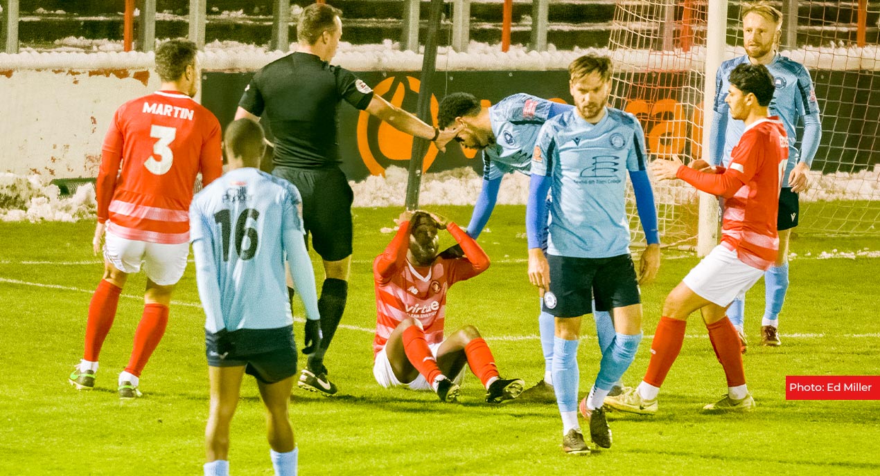 The talking point of the half occurred when Bingham got a yard or two on the Eastbourne defence and cut the ball back for Sterling. He had sight of goal but turned Jack Burchell, going over the defender’s outstretched leg. Home players clamoured for the penalty but then couldn’t believe when referee Norton reached for his pocket to book the Fleet player for simulation.