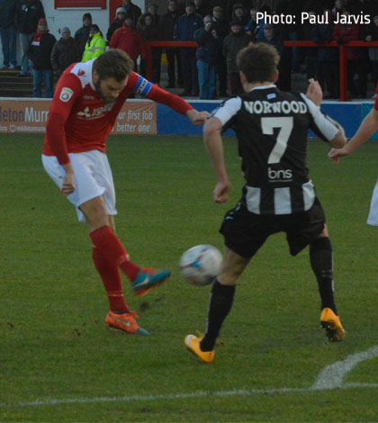 Fleet were playing some tidy stuff in midfield with the two Lewises allowing McMahon to get forward, while Shields and Kiernan impressed down either wing. But Shields succumbed to what appeared to be a mild leg injury, allowing Anthony Cook an entrance and he supplied a decent cross that Theo Lewis headed just wide. Kiernan then showed a clean pair of heels from a Kedwell pass but his shot hit Chris Stokes’ outstretched boot and bobbled just wide for a corner.