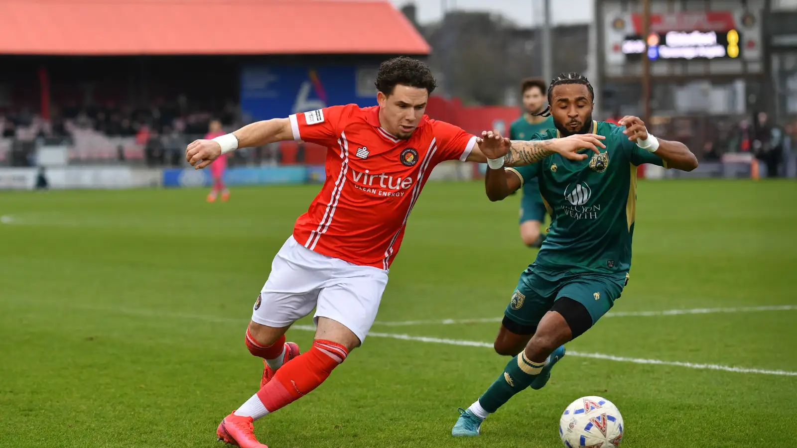 With five minutes to go to the break, Fleet’s pressing almost unlocked the Angels defence. Peake played a neat one-two with Charlie Seaman whose back-heel was pounced on by the No.17 inside the box and he swung a low shot whistling past Shala’s outstretched glove. The half closed with Seaman’s firm strike parried behind for another corner by Shala and Coley sending a shot into similar territory.