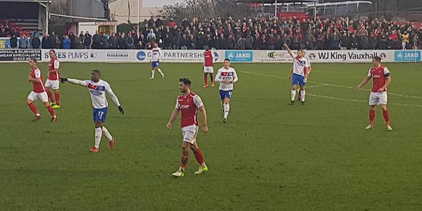 Dagenham had a reputation for attacking play and they certainly showed it after the restart, laying siege to the Fleet goal for much of the 45 minutes but their finishing let them down for much of that time. Andre Boucaud wasted a good build-up on 49 minutes by blasting the ball over the bar while Fleet were restricted to counterattacks. Coulson led one with fantastic vision to find Weston with a crossfield pass on 55 minutes but his cross into Kedwell was cleared. Fleet were almost in on goal again a few minutes later when Boucaud’s dreadful pass back to defence was straight to Kedwell who found Weston but his shot was turned behind for a corner.