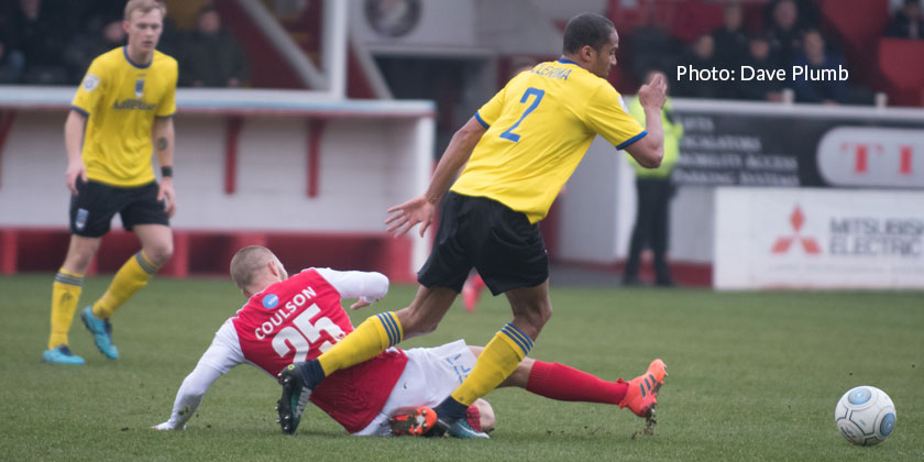 But with Fleet surviving that scare, they took the lead after just four minutes. Andy Drury found space to roam forwards in midfield and as he was closed down he laid a short-range pass into the feet of Luke Coulson who took a glance and drove a low ball out of Carl Pentney’s reach and into the corner of the goal for 1-0.