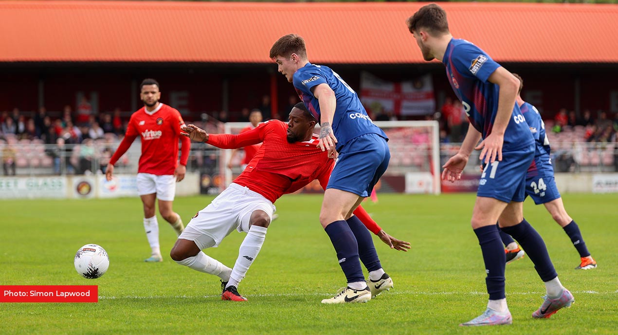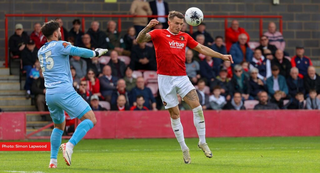 Fylde – without top scorer Nick Haughton – didn’t create much but their first attack was denied by superb defending from Bryant Bilongo who got an important foot in on Jon Ustabasi with Mark Cousins gettng back to his feet. A free kick minutes later from a good position was sent straight into the gloves of Cousins.