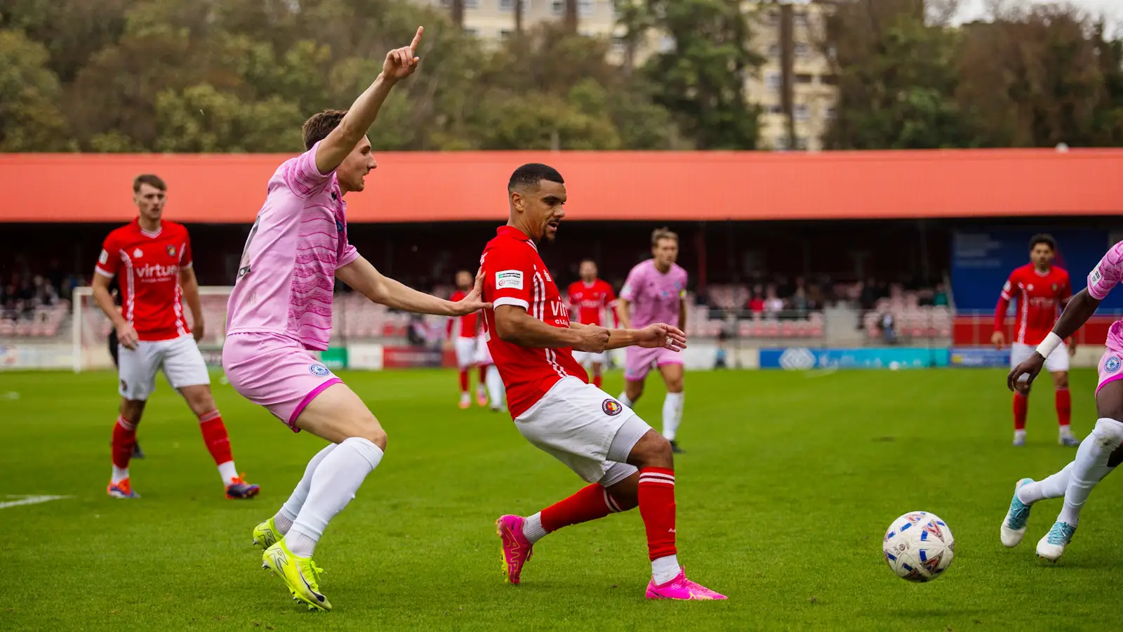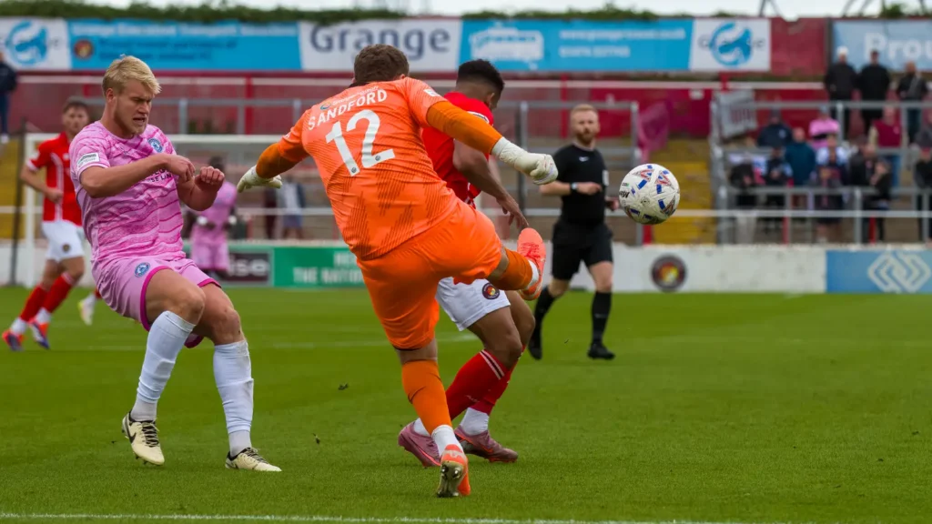 Aaron Cosgrave just couldn’t turn home a cross as the Fleet went looking for the lead and Chapman went over in the box as Sandford came across him for a tackle. But with 10 minutes left Fleet grabbed what they thought was the winner. Substitute Finlay Barnes, who had only been on the pitch a couple of minutes, carried the ball from midfield before an excellent effort was deflected into the top corner.