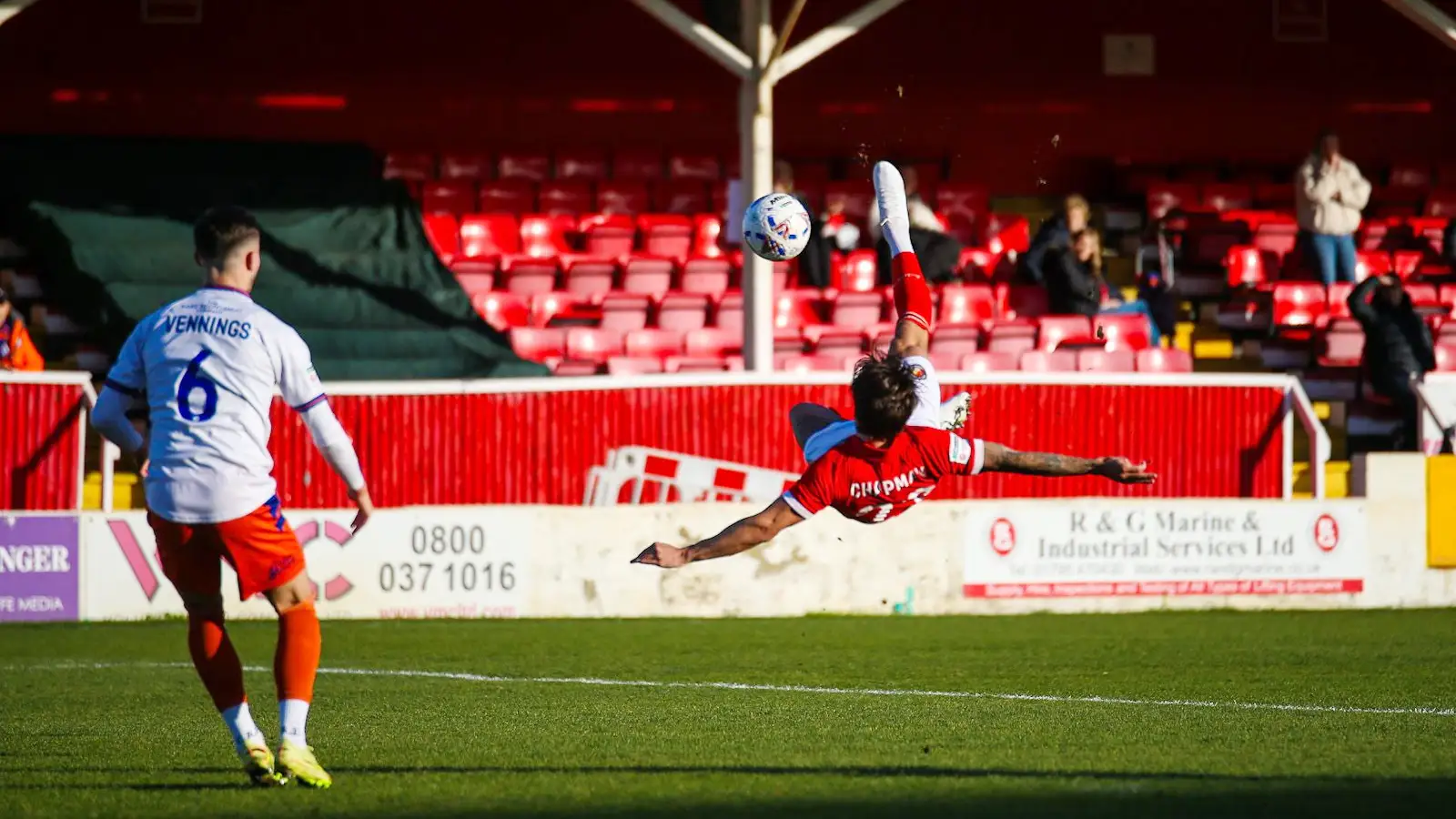 The opener arrived just past the quarter-hour mark when George Moncur’s good work unlocked Braintree down the left. Charlie Seaman’s initial effort was blocked but sat up for Chapman who acrobatically leapt into the air with a bicycle kick to fire the Fleet in front.