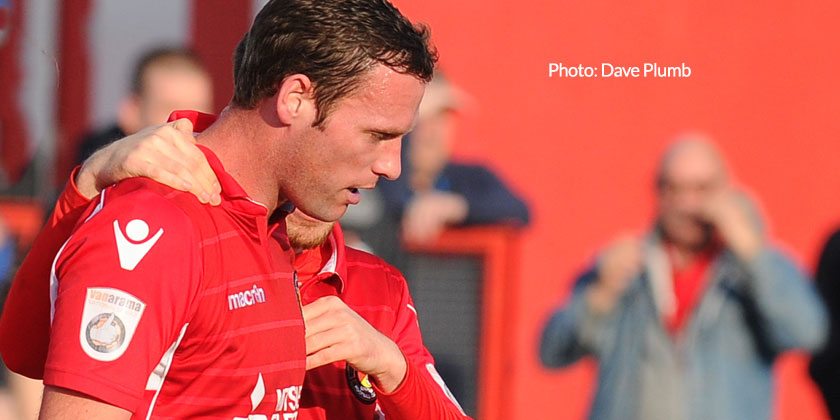 Jack Powell came in for the suspended Dean Rance in the only change of the afternoon but within five minutes of the start, Fleet were forced into another switch. Dave Winfield went to ground in the opposition’s penalty box and quickly signalled that he would be unable to continue, giving Mark Phillips his first taste of football since the FA Trophy clash at Kidderminster almost two months ago.