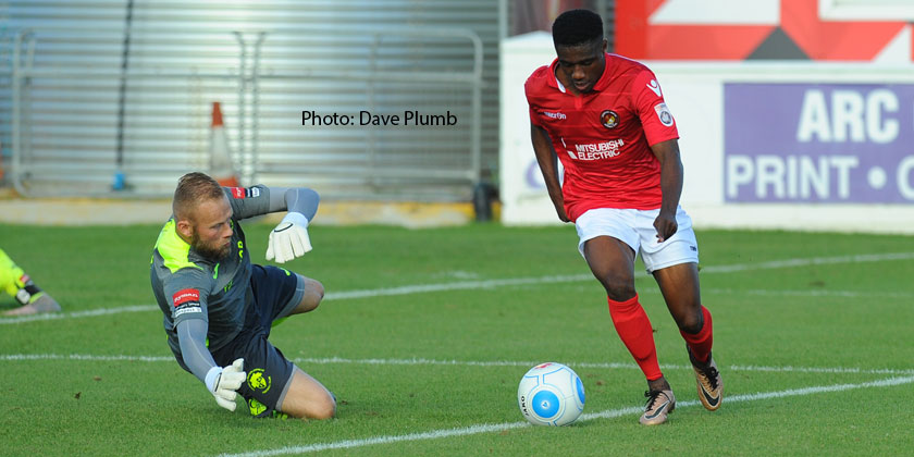 Indeed it was the visitors who created the first chance of note on 18 minutes when former Dartford winger Ben Swallow found space down the right to cross for Jason Prior whose header at the far post was on target and needed a fast-reaction save from Nathan Ashmore to prevent the goal. But from the resulting corner, Fleet broke at speed and Darren McQueen found Anthony Cook who raced away down the Fleet left. Too swift for the defenders to catch, Cook homed in on Ryan Young’s goal and slung a great shot past the goalkeeper for 1-0.