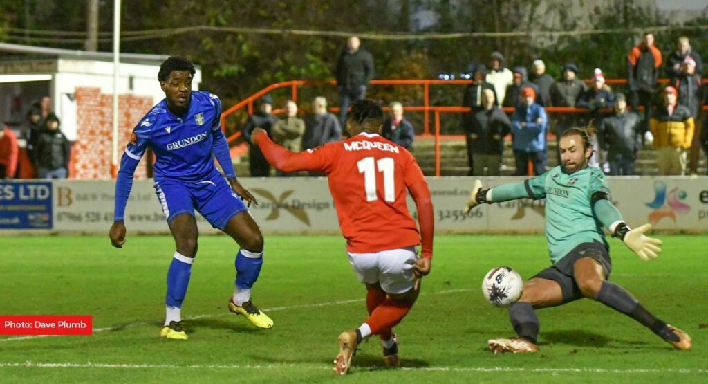 Stortford weren’t creating much but Osman Sow got the wrong side of the last Fleet man as Gio McGregor’s pass slid through to him but Cousins dived on that.