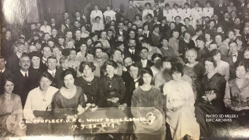 This photo, taken on St Patrick’s Night – 17th March, 1920 – shows members of Northfleet United FC’s supporters committee settling down for one of the season’s annual fundraising events – the whist drive and dance.
