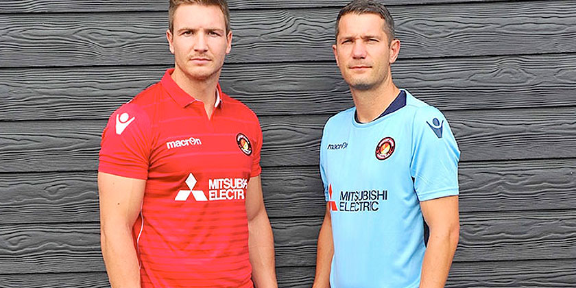 This season’s shirts – modelled by new signings Dave Winfield and Mark Phillips – are in traditional Fleet red (home) and a sky blue colour (away), once again featuring the logo of sponsors Mitsubishi Electric on the front and new partners GDM Partnership on the back.