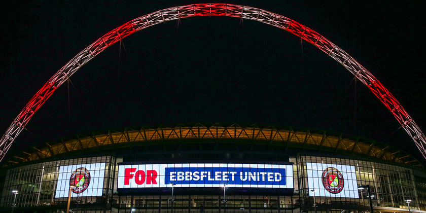 Pictured above (or VIEW HERE if cropped) are the Fleet’s colours, name and crest emblazoned in lights to mark our 2008 appearance at the national stadium, when we beat Torquay United 1-0 in front of 40,186 in the FA Trophy Final.