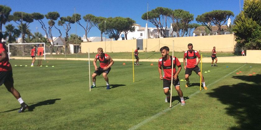 After a lunch break and a short coach ride to the local town, Quarteira, the squad did their first strength session at the local Champions gym. Nathan Ashmore’s attempts to lift the first set of weights (see below) almost resulted in the Fleet keeper taking part of the floor with him as well!