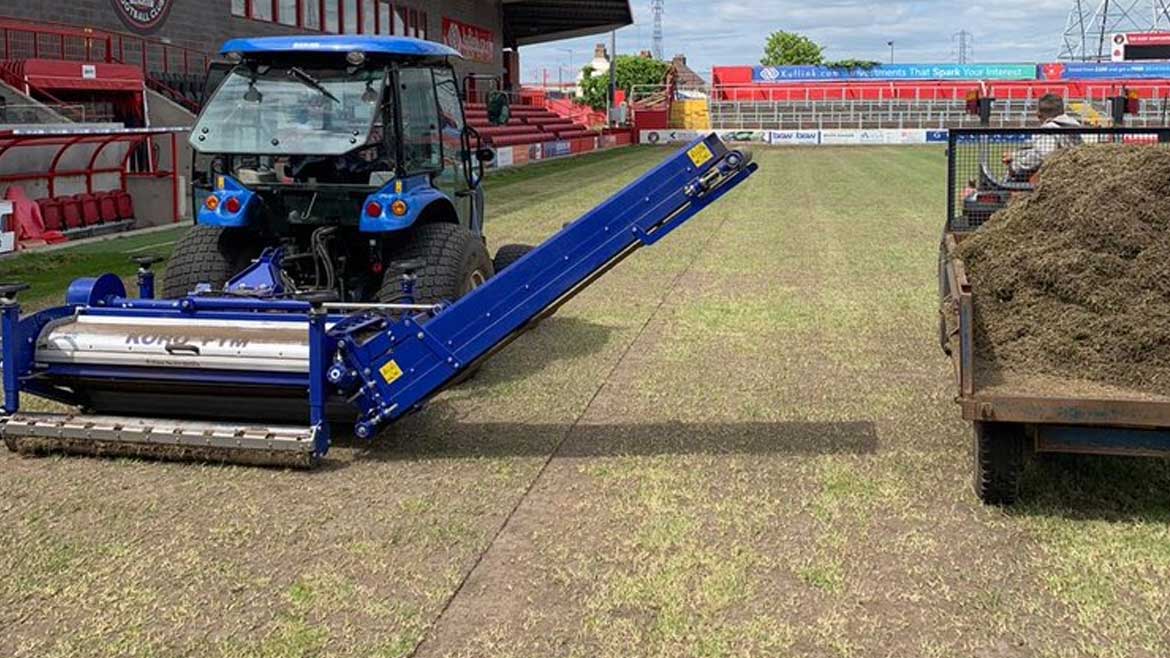 The first stage – using a fraise mower – removes extra growth such as weeds or thatch to a surface depth around 50mm. The pitch was then raked and cleaned before a top dressing of sand was added.