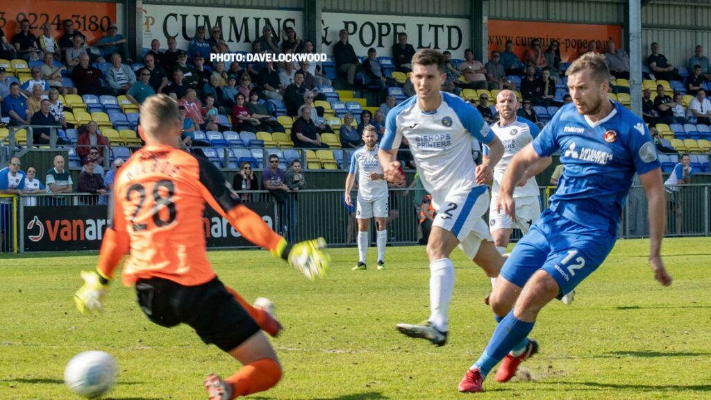 Theo Lewis beat Chris Bush to a ball from 20 yards and slung a dipping effort just over the bar as Fleet looked off the pace.