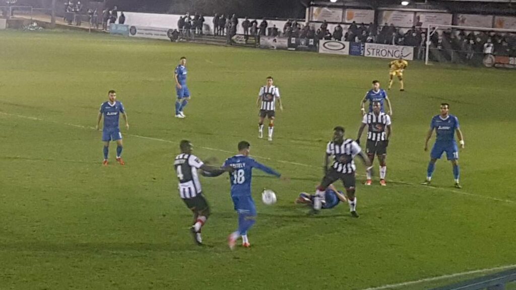 The visitors made the early running, Andy Drury straight into the action with a shot just wide. Dave Tarpey, returning to Maidenhead on loan from Barnet, didn’t look at all rusty and was quick on to balls forward in the opening spell.