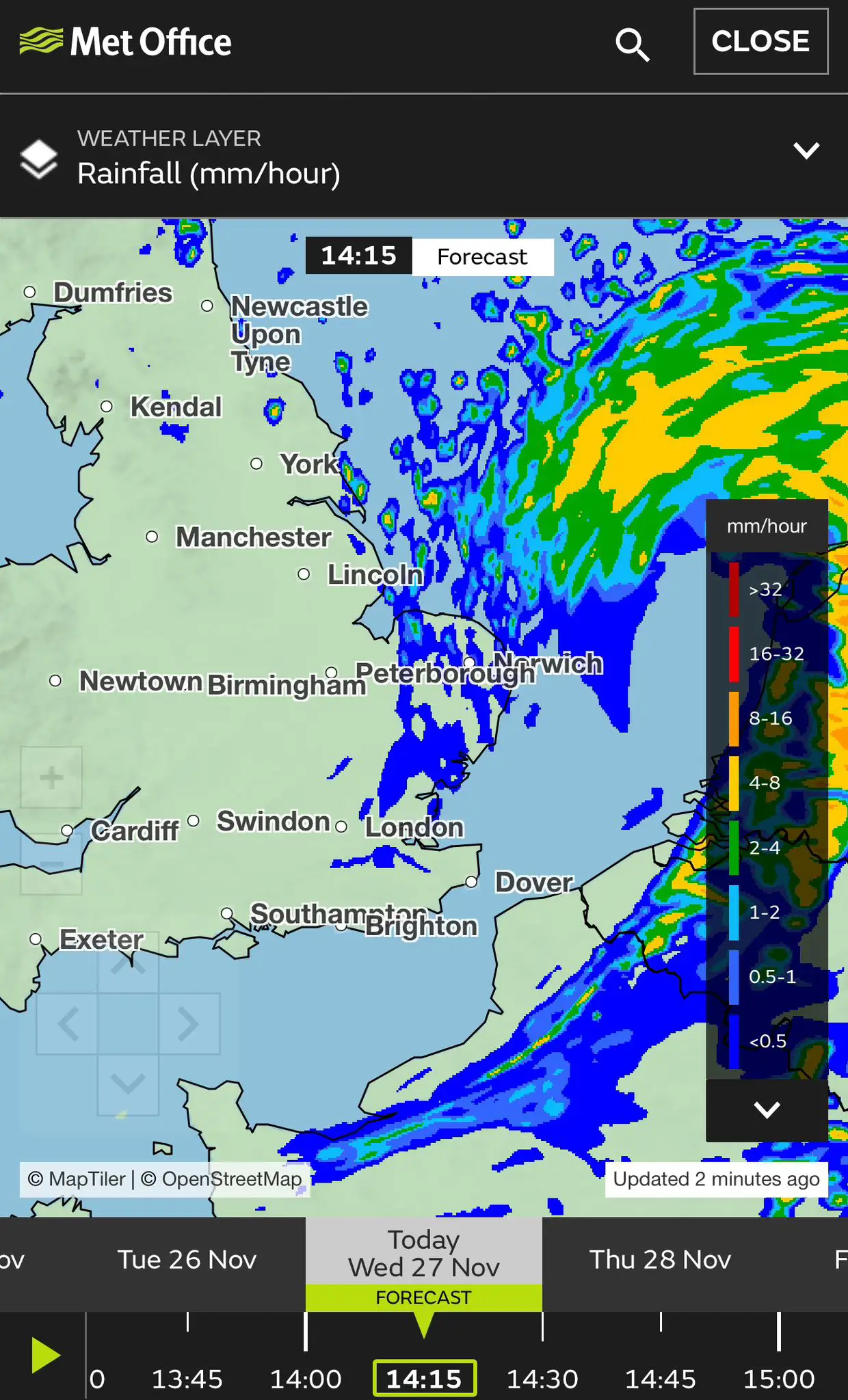 Heavy rain fell overnight as forecast and the below radar picture shows the storm front and precipitation forecast has now passed.