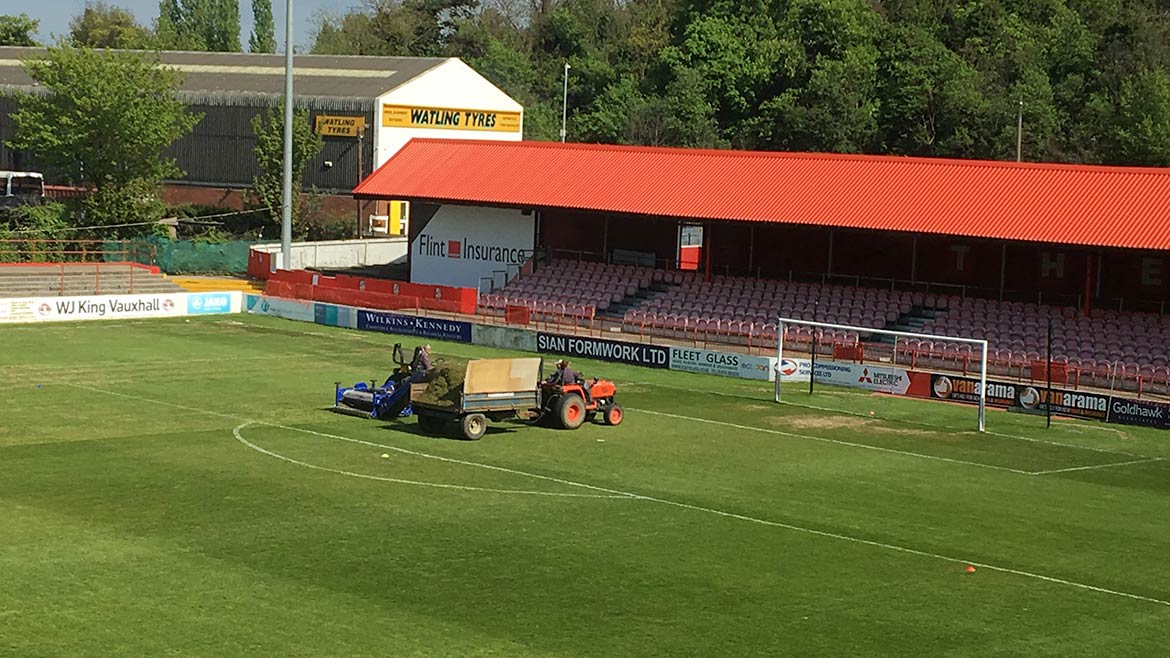 Fleet’s managing director Dave Archer said, “We wanted to start work on the playing surface as early as possible this year to ensure the pitch was in great nick for our opening three friendly matches against EFL opposition. Our Head Groundsman James Hare is organising the whole pitch regeneration and he wanted to get on with an early start – and you can’t get much earlier than the first week after the end of the season!”