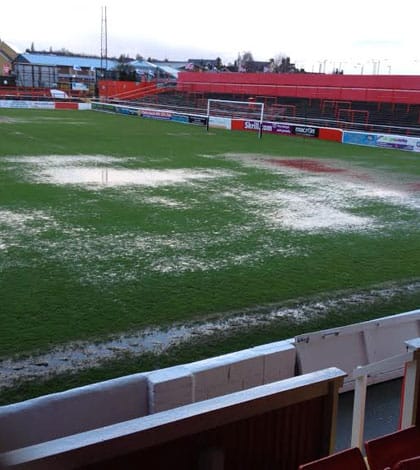 The photo, right, shows the Stonebridge Road pitch early on Friday morning – much of this surface water has been cleared by a combination of our drainage systems and the considerable efforts of ground staff and the pitch is looking much better at the moment as a result.