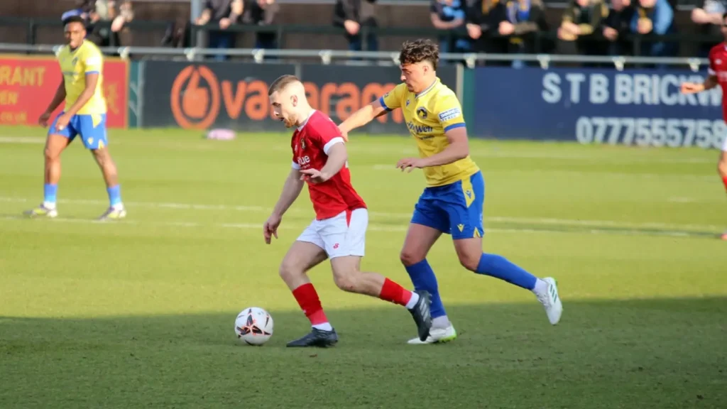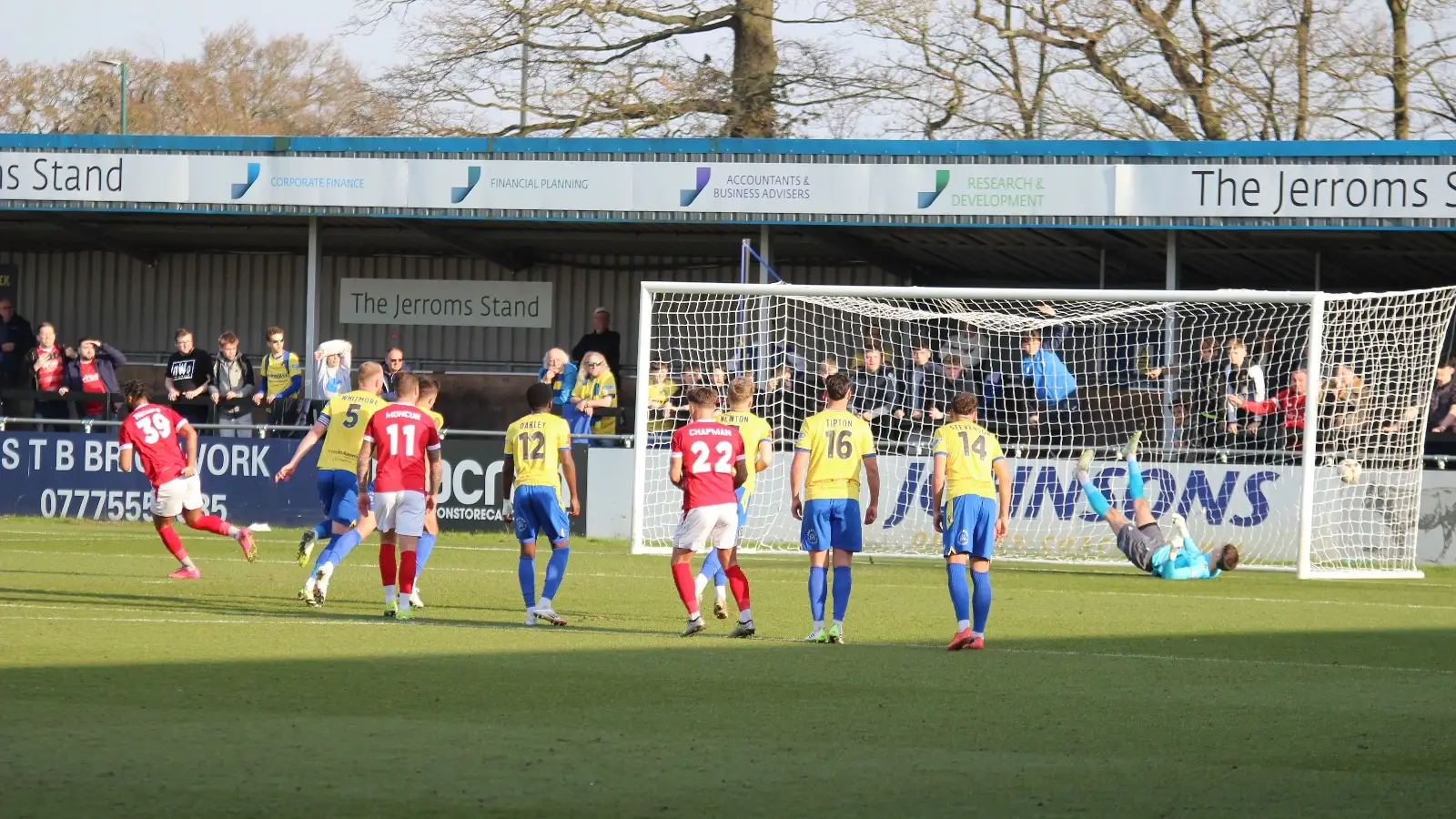 Moments later, there was a free-kick at the other end when Alex Lankshear brought top scorer Jack Stevens down on the edge of the box and after lengthy treatment for their player (who later had to be substituted), Moors hit the set-piece off for a corner via Page’s midriff. Page conceded another free-kick a few minutes later on the other side of the box but that one was fired well over.