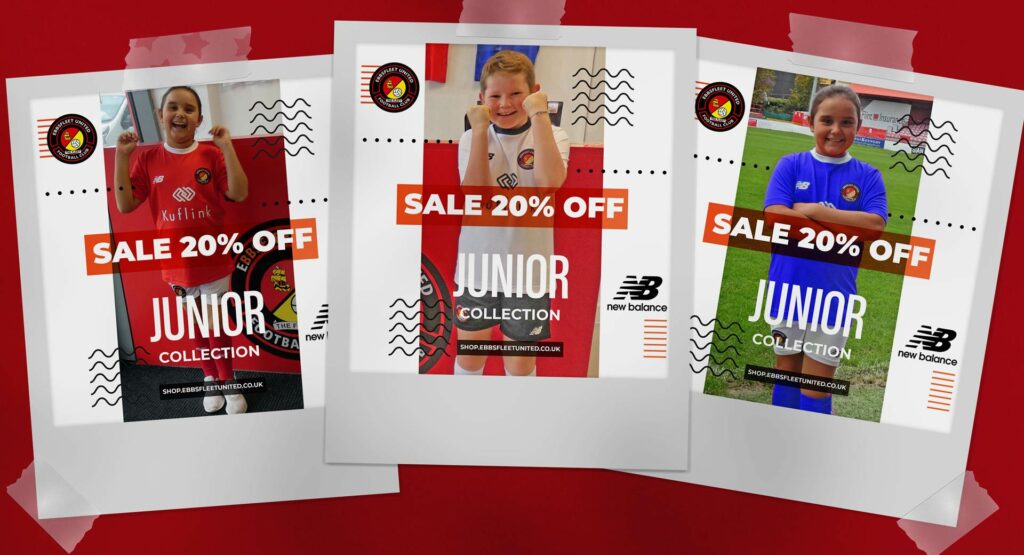 The Fleet’s home, away and goalkeepers’ replica shirts in junior sizes are now on sale with a fantastic 20% discount.