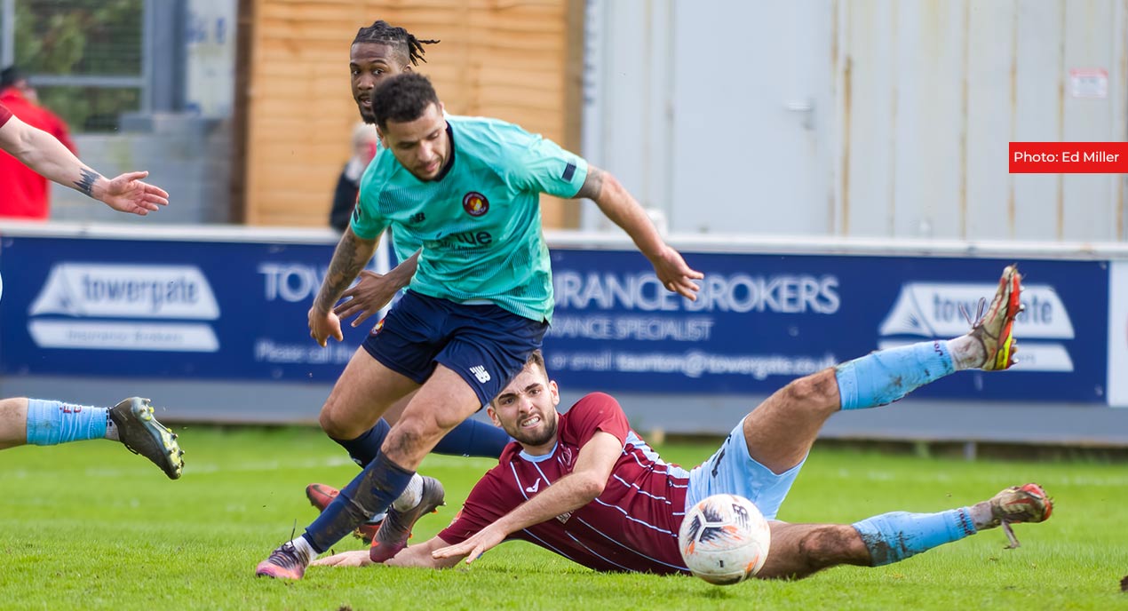 Omari Sterling-James was introduced on the hour after his return from international duty and he was straight away into the fray, teasing the Taunton full-backs before hitting the side-netting with a chance. There was plenty of resolve and even more possession for the Fleet but Taunton’s tight defence which they have prided themselves on this season stood firm.