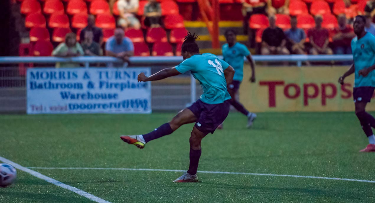 Clearly rattled, Worthing looked like they couldn’t wait to get into the dressing room and further damage was almost done when Poleon and Toby Edser combined to square a ball to Bingham who smashed it off the underside of the crossbar and away. Edser’s commanding, skilful run two minutes before the break deserved more and he found Poleon who had the hat-trick in his sights but his shot was wide of the post.