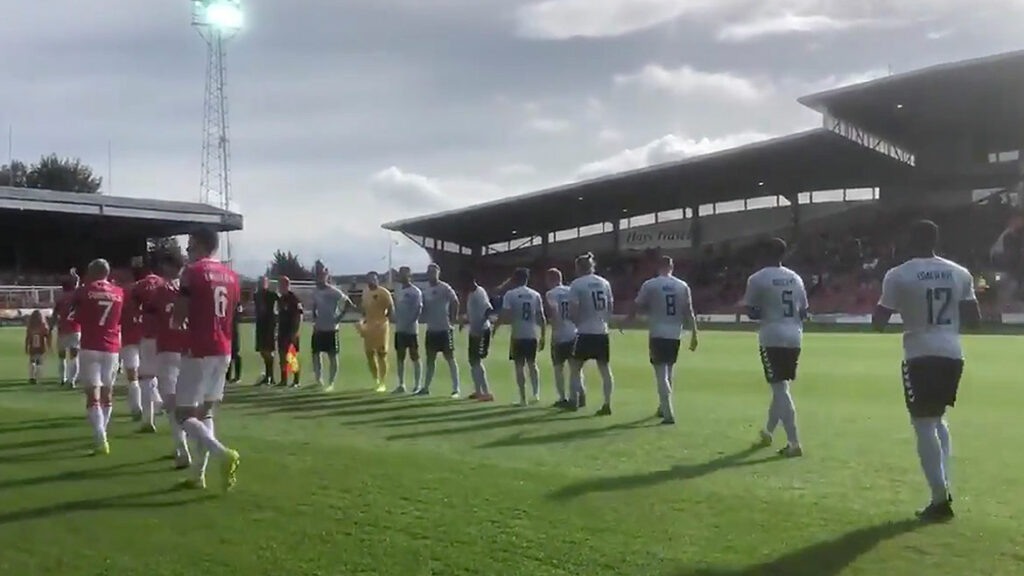 Wrexham came flying out of the traps with an attack on the Fleet goal straight from kick-off. But in a quick-tempo start, Ayo Obileye headed just past the post from Tyler Cordner’s flick-on and then James Ball’s persistence won possession and he sent a decent shot just off target.