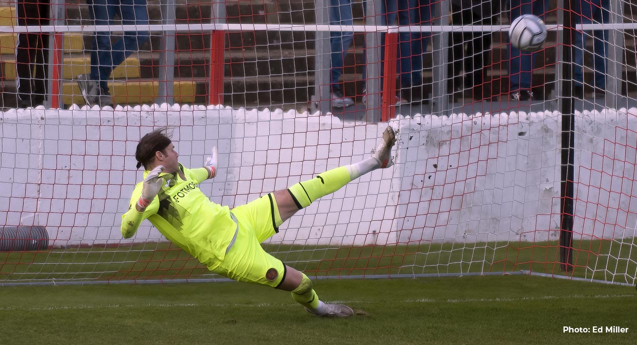 Fleet did get their penalty three minutes later, however, when Cundle’s corner to Romain was blocked by the arm of Donaldson. It was Cundle who assumed the responsibility in the absence of the injured Rakish Bingham and he hit a firm mid-height drive down the middle, sending Julian the wrong way but the goalkeeper somehow managed to get a boot to the ball to send it spinning away from goal.